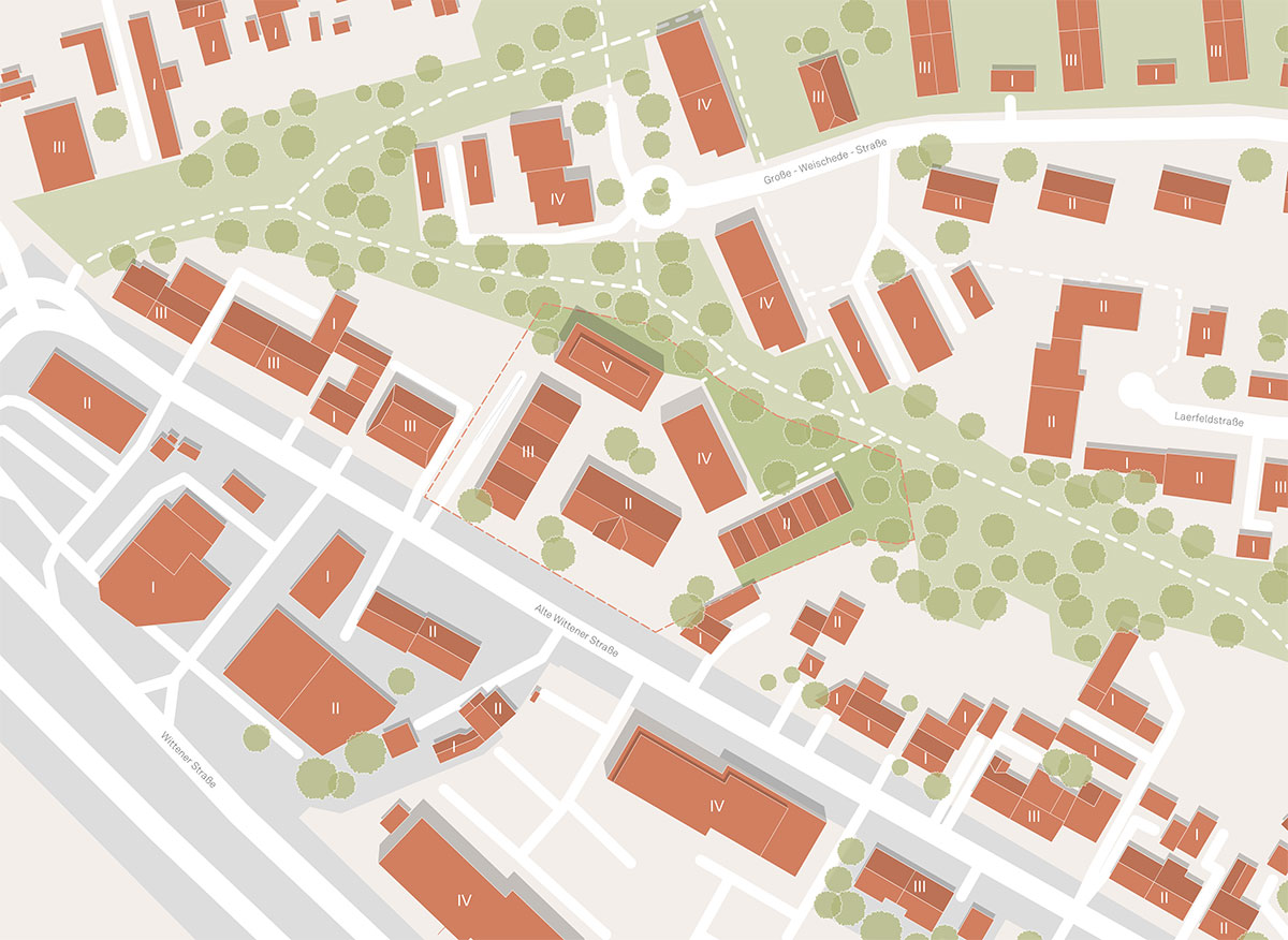 Auf dem Grundstück der alten Feuerwache in Bochum wird mit vier Baukörpern nachverdichtet. Die linke Gebäudespange öffnet sich in Richtung Gewerbegebiet im Süden und die rechte Gebäudespange öffnet sich zum Wohnbaugebiet im Norden.