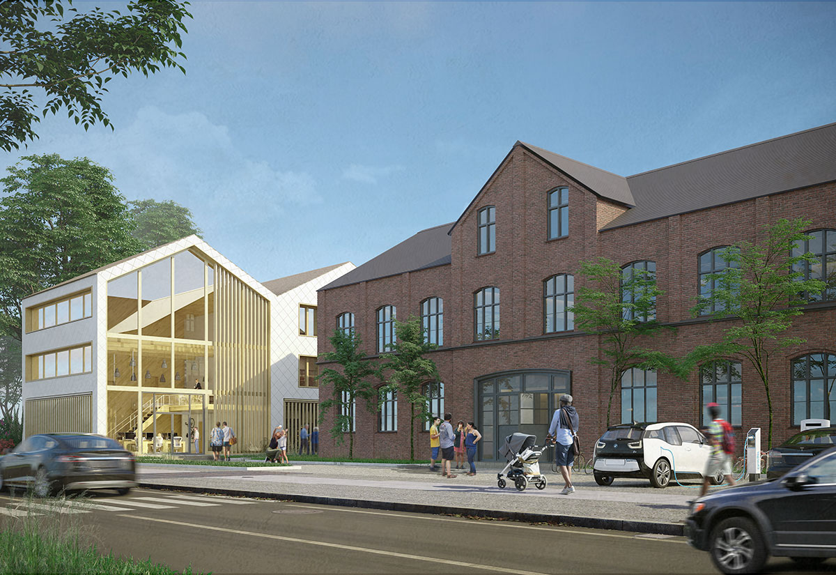 Das westliche Bürogebäude schiebt sich nach vorne zur Straße und nimmt die Flucht der Nachbarbebauung auf. Dadurch entsteht vor der Feuerwache ein Vorplatz als einladende Geste. Hier treffen Menschen aufeinander und werden zum Verweilen eingeladen. Links neben der Feuerwache, an dem Büroriegel vorbei, erfolgt über den gemeinschaftlich genutzten Innenhof der Zugang zu einem weiteren Bürogebäude.