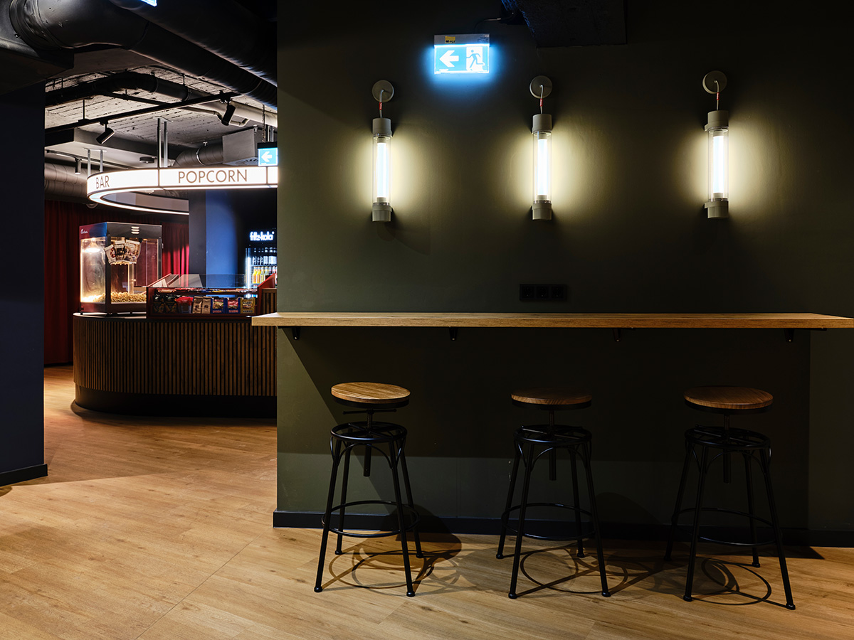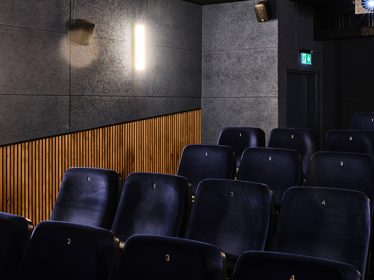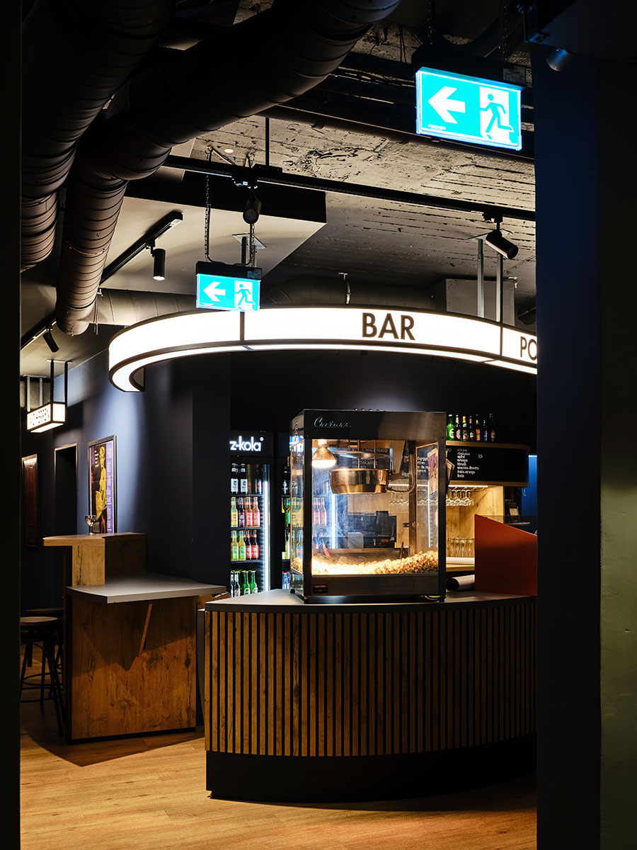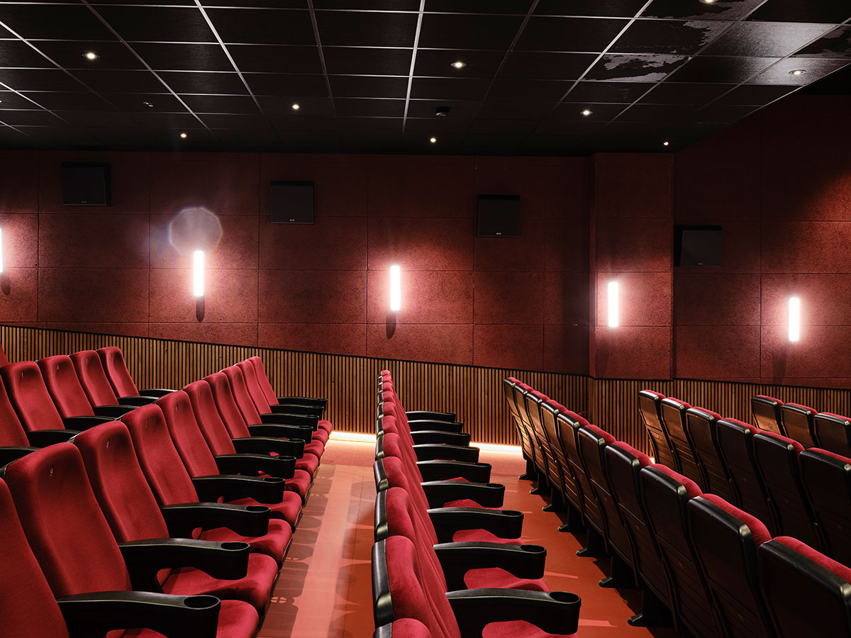 Die Umsetzung der hohen Anforderungen an Technik und Akustik im Bestandsgebäude stellte eine der größten Herausforderungen bei diesem Projekt dar. Das Kino befindet sich unter einem Wohn- und Geschäftshaus und war durch viele An- und Umbauten in der Vergangenheit sehr „verbaut“. Die architektonische und innenarchitektonische Lösung, um diese Schwierigkeiten zu meistern, erforderte ein hohes Maß an Kreativität und Fachwissen. Zudem war es notwendig, budgetorientiert zu arbeiten und dabei sowohl gestalterisch als auch technisch das Beste herauszuholen.