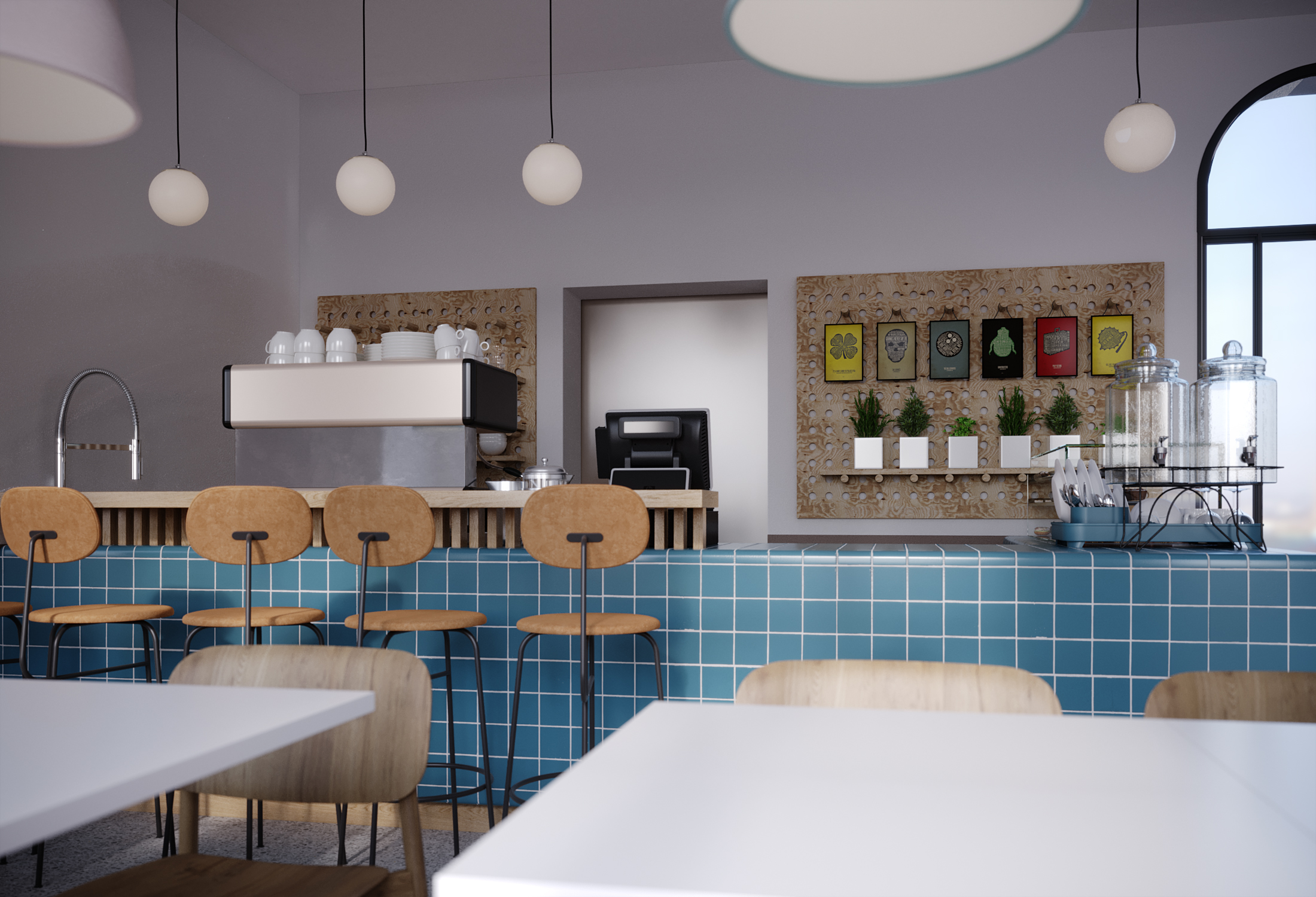 Die Rezeption ist gleichzeitig auch ein Café und lädt die Anwohner und Besucher gleichermaßen zum Verweilen und ankommen ein. Dies ist nicht nur eine Geste, sondern vielmehr eine Haltung die in der Architektur ihren Ausdruck findet.