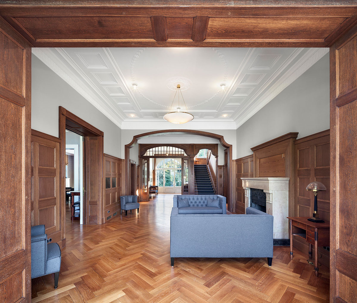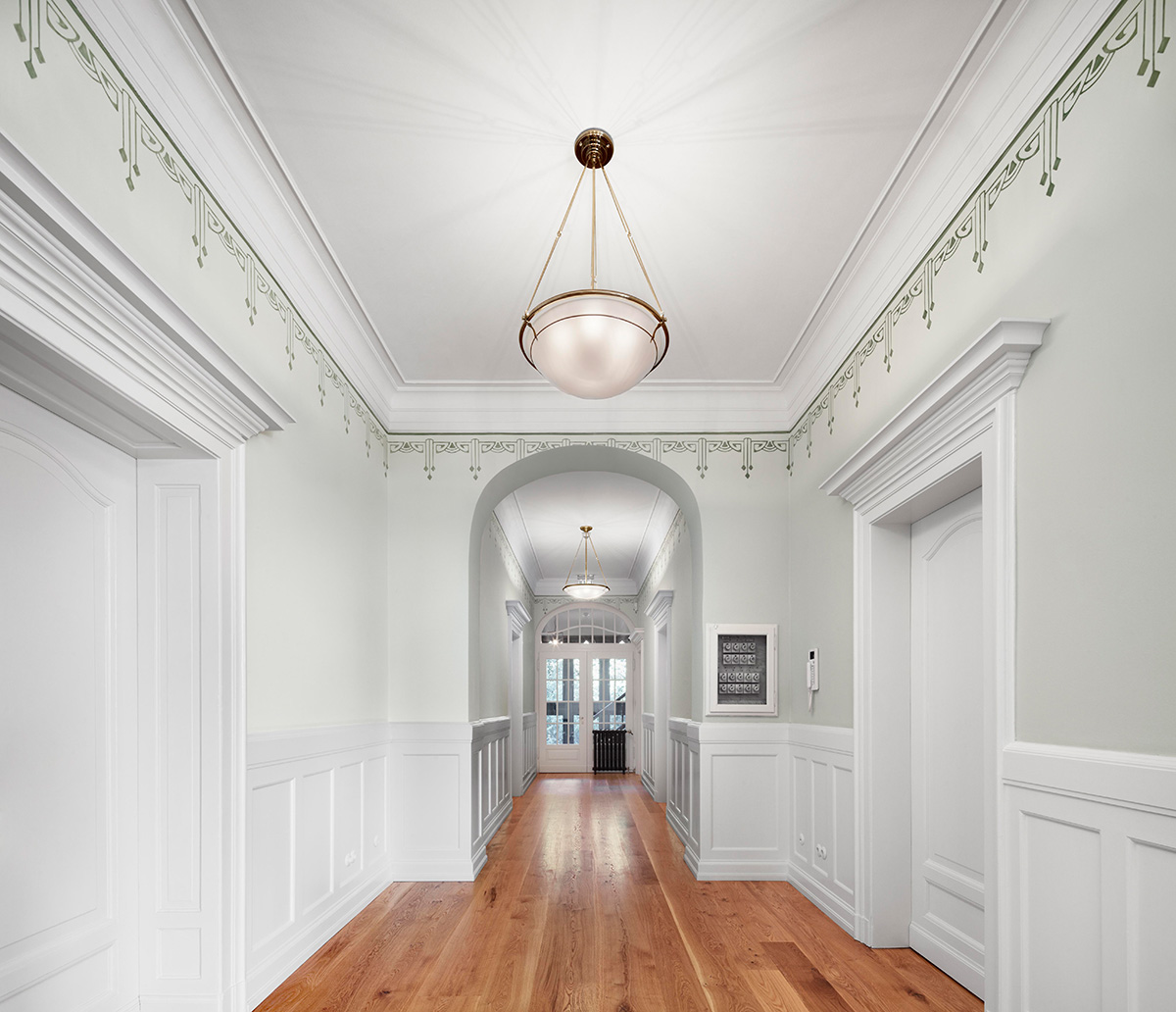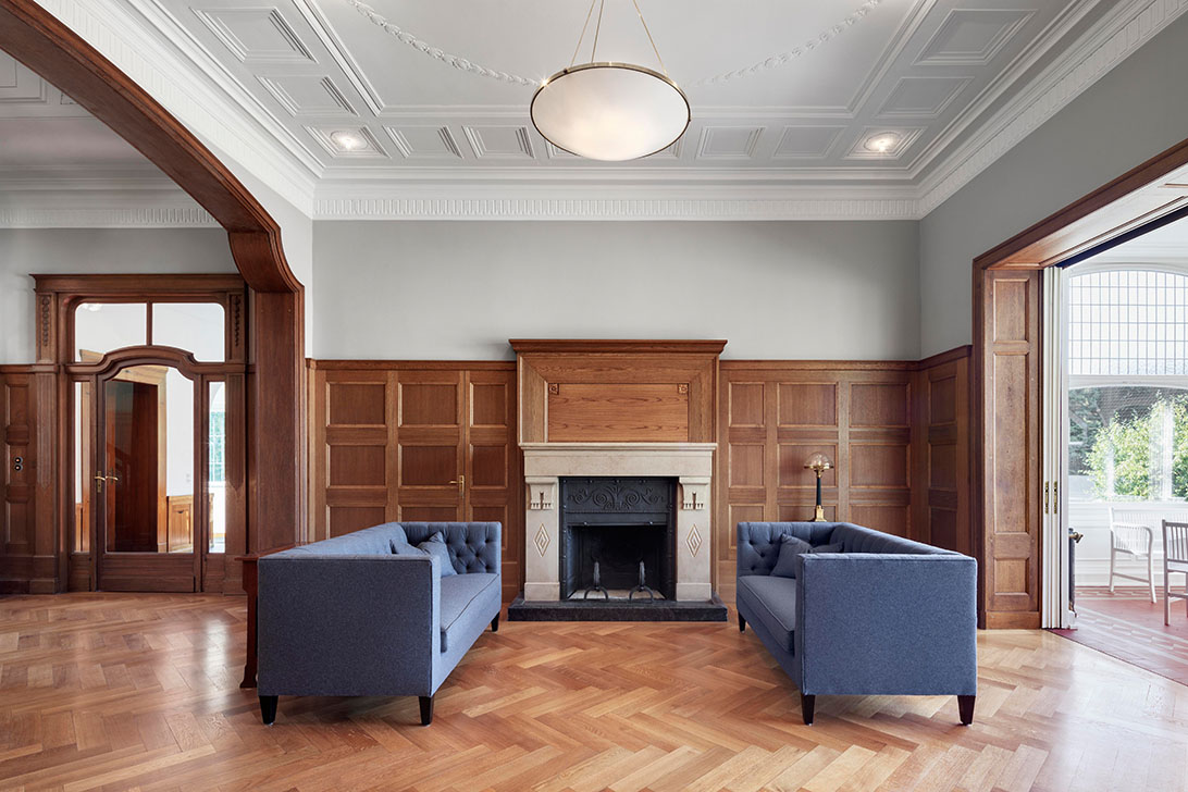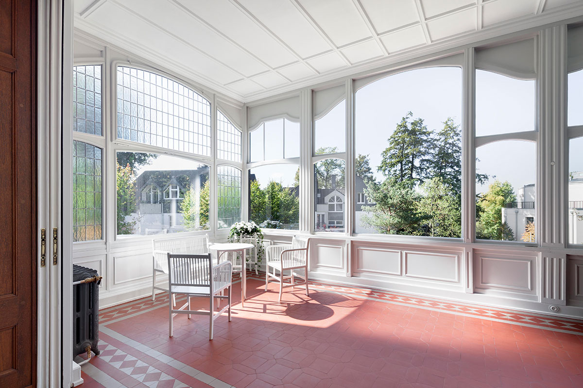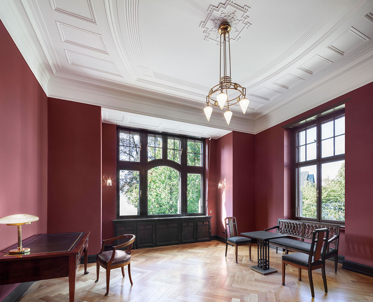 Die Haustechnik und Elektrik wurden dezent eingebunden, Möbel und Leuchten harmonisch integriert, und auch die Außenanlagen orientieren sich an historischen Plänen. Des Weiteren wurden die schmiedeeiserne Toranlage und historische Mauern wiederhergestellt. So entstand eine denkmalgerechte Villa, die historischen Charme, moderne Funktionalität und eine elegante, private Wohn- und Arbeitsatmosphäre verbindet.