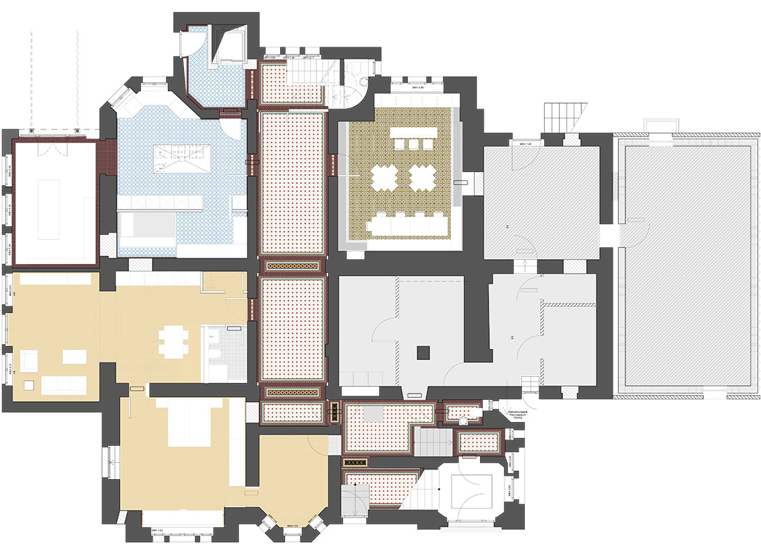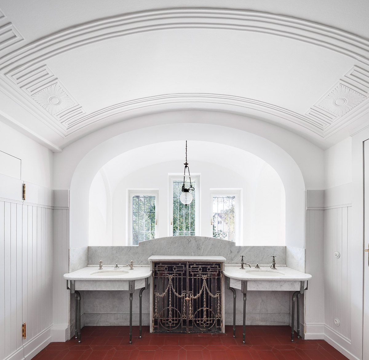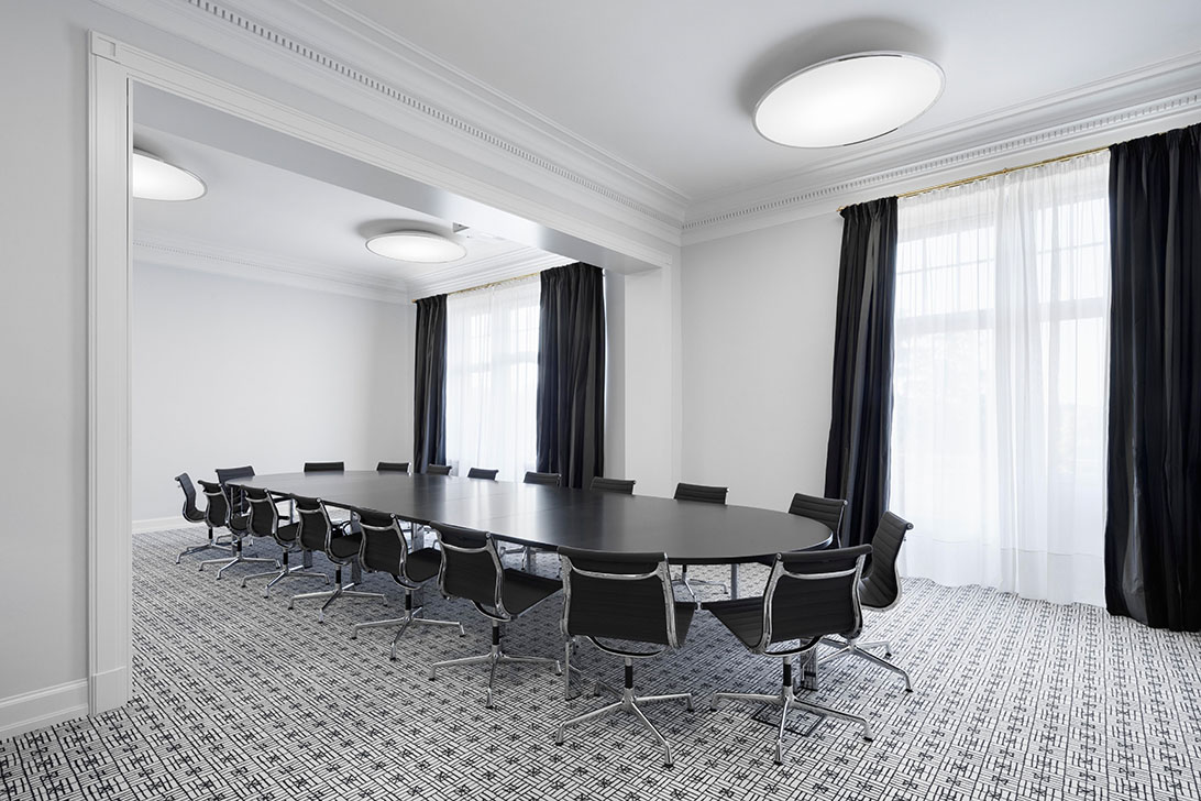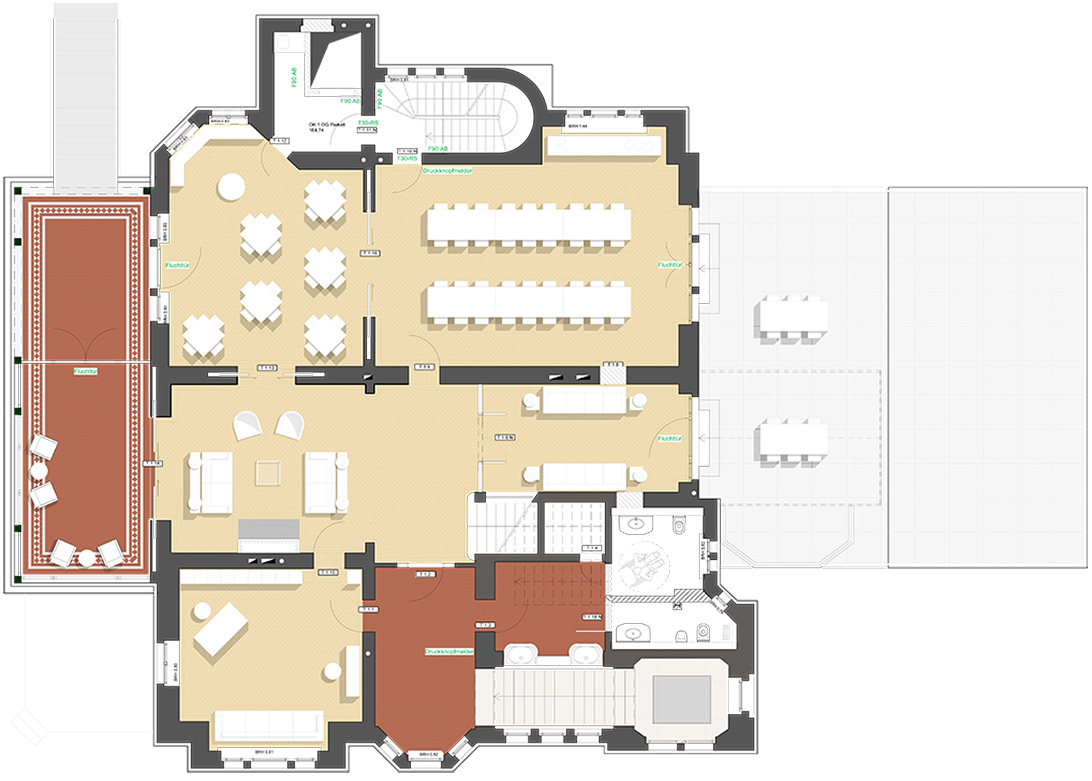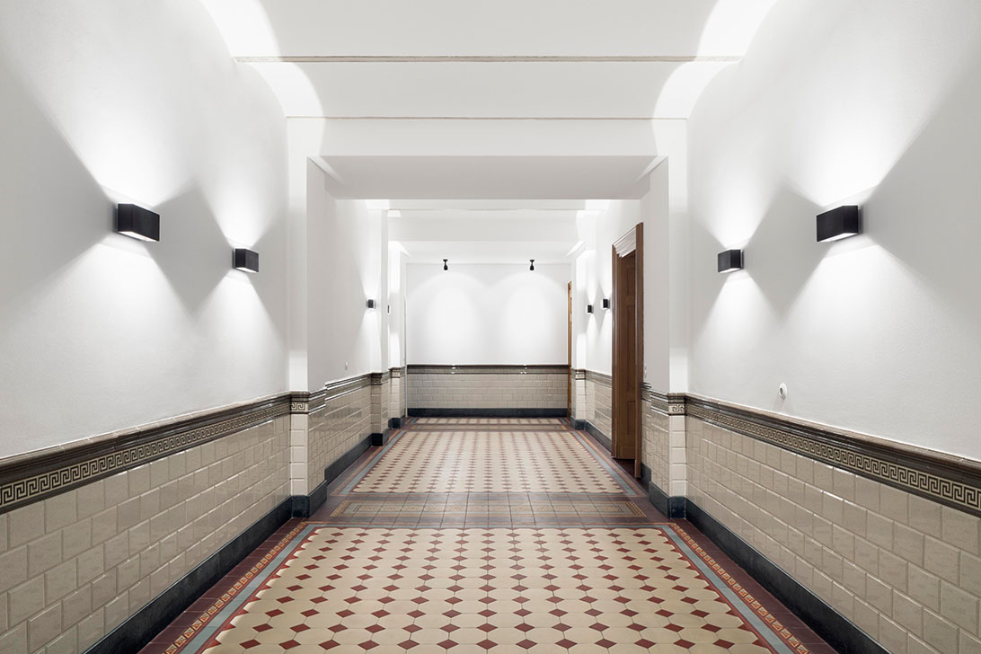 Die Haustechnik und Elektrik wurden dezent eingebunden, Möbel und Leuchten harmonisch integriert, und auch die Außenanlagen orientieren sich an historischen Plänen. Des Weiteren wurden die schmiedeeiserne Toranlage und historische Mauern wiederhergestellt. So entstand eine denkmalgerechte Villa, die historischen Charme, moderne Funktionalität und eine elegante, private Wohn- und Arbeitsatmosphäre verbindet.
