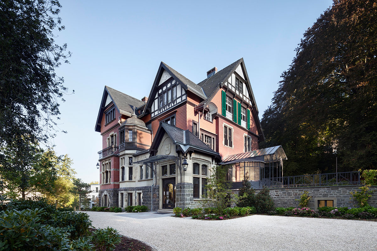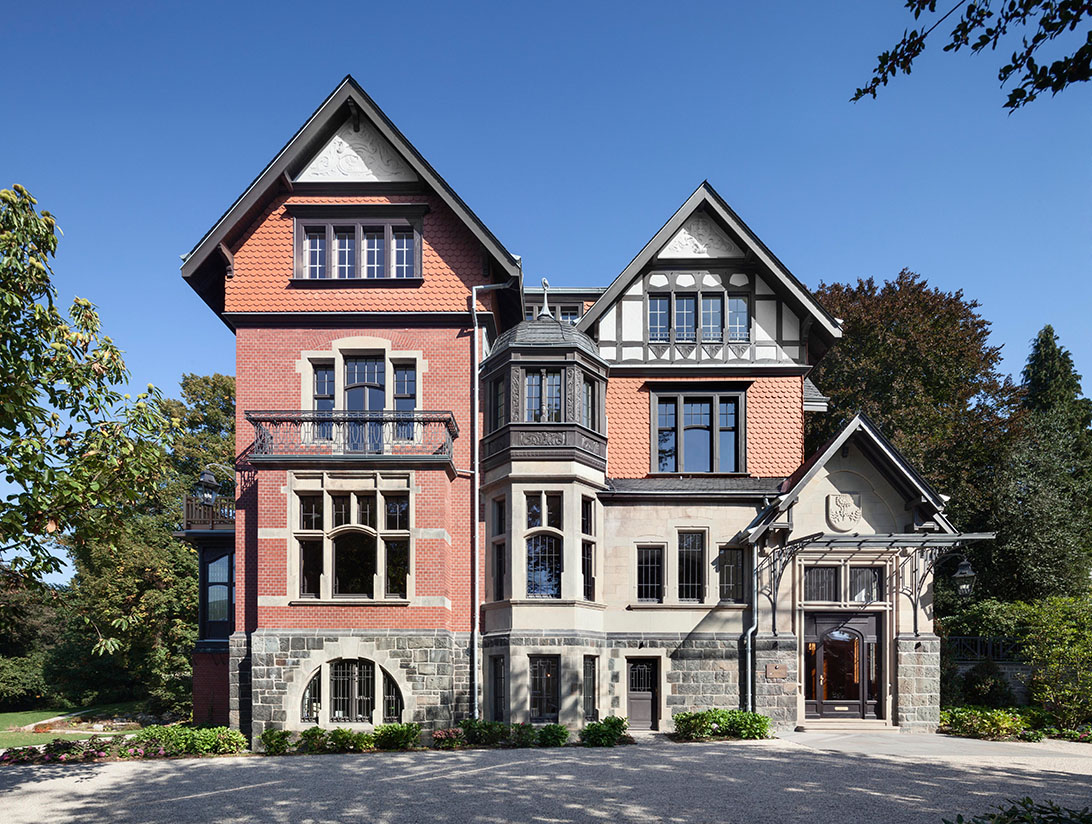 Mehr als 100 Jahre später dient die Villa weiterhin als privates Bauwerk und zugleich als Ort für gesellschaftliche Anlässe, Tagungen und Veranstaltungen. Ziel der jüngsten Sanierung war es, die Fabrikantenvilla der Jahrhundertwende umfassend zu erhalten und ihren historischen Geist wieder erlebbar zu machen. Türen, Fenster, schmiedeeiserne Arbeiten, Täfelungen und originale Ausstattungsgegenstände wurden restauriert oder auf Basis historischer Fotos ergänzt. Anpassungen an Türen, Wandqualitäten und Fluchtwegen erfolgten sensibel im Einklang mit dem Bestand. Ein barrierefreier Aufzug wurde an der ursprünglichen Stelle des Speisenaufzugs integriert, während Dach, Zinnen, Türme und Glockenturm einschließlich Glocke und Fahnenmast fachgerecht restauriert wurden.