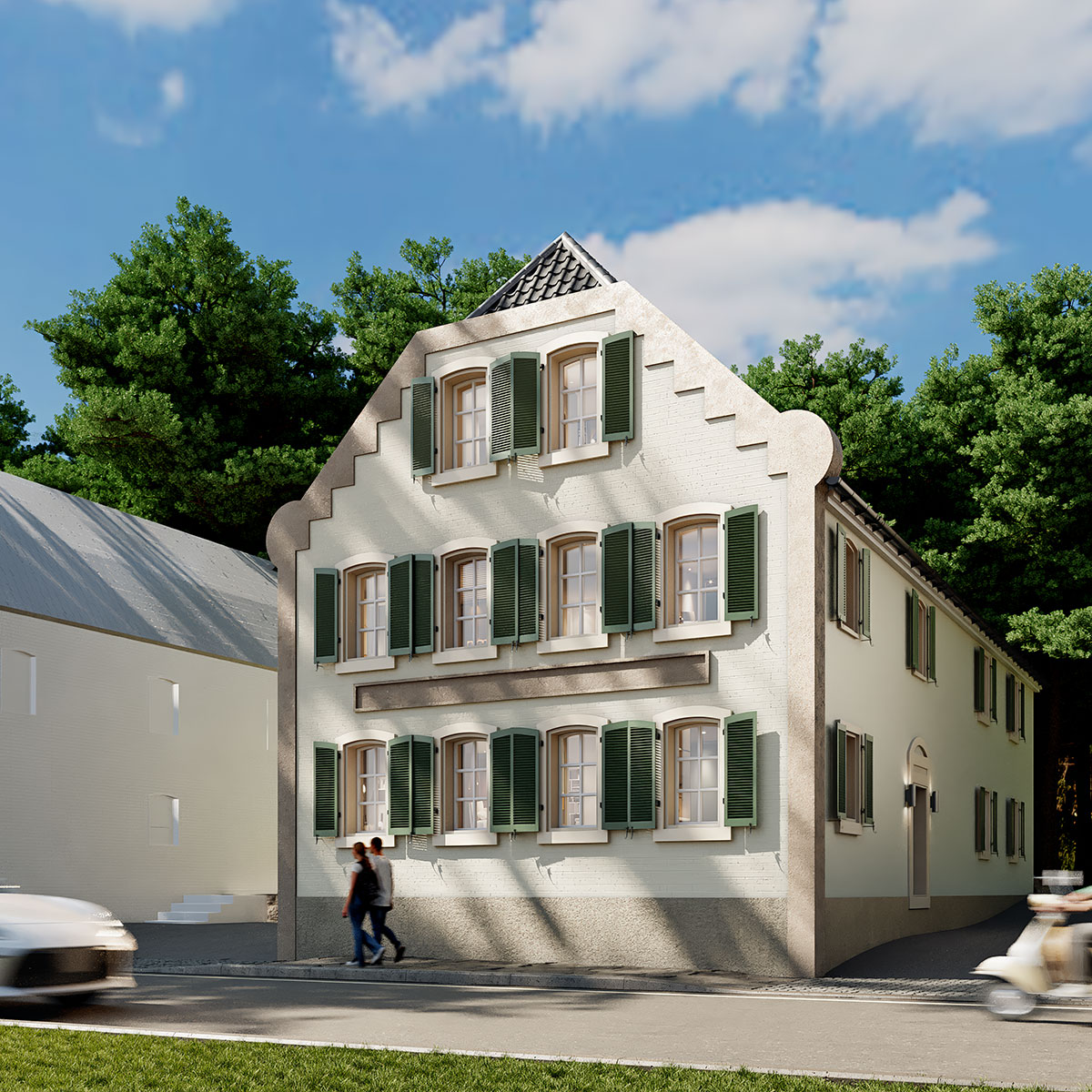 Das „Haus Leven“ liegt in privilegierter Lage in Leverkusen-Hitdorf mit direktem Blick auf den Rhein. Das denkmalgeschützte Wohn- und Geschäftshaus aus dem späten 18. Jahrhundert ist von besonderem historischem Wert. Die Bausubstanz weist jedoch erhebliche Schäden auf. Schädlingsbefall und Feuchtigkeit haben die Tragstruktur so stark beeinträchtigt, dass das Gebäude derzeit nur durch eine temporäre Notabstützung stabilisiert werden kann. Eine umfassende Kernsanierung des Altbaus ist daher unvermeidlich und wird durch einen rückwärtigen Anbau ergänzt.