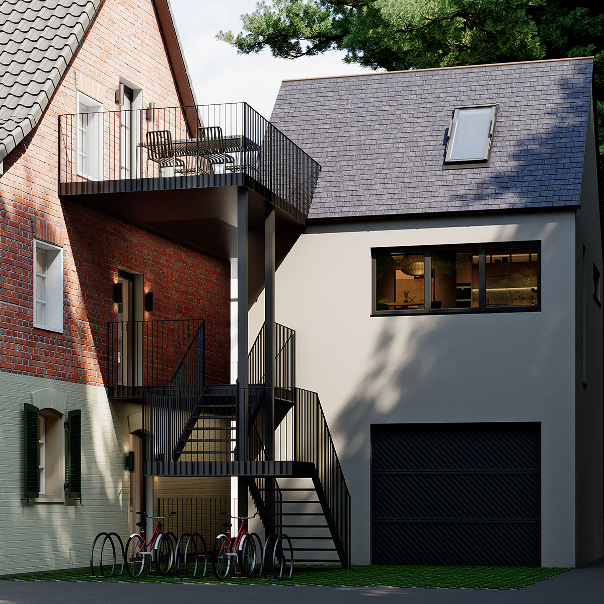 Im Rahmen der Altbausanierung wird die Tragstruktur grundlegend erneuert und eine äußere Erschließung auf der Hofseite geschaffen. Diese Maßnahmen ermöglichen es, drei Wohnungen unterschiedlicher Größen und eine Büroeinheit im Erdgeschoss unterzubringen.